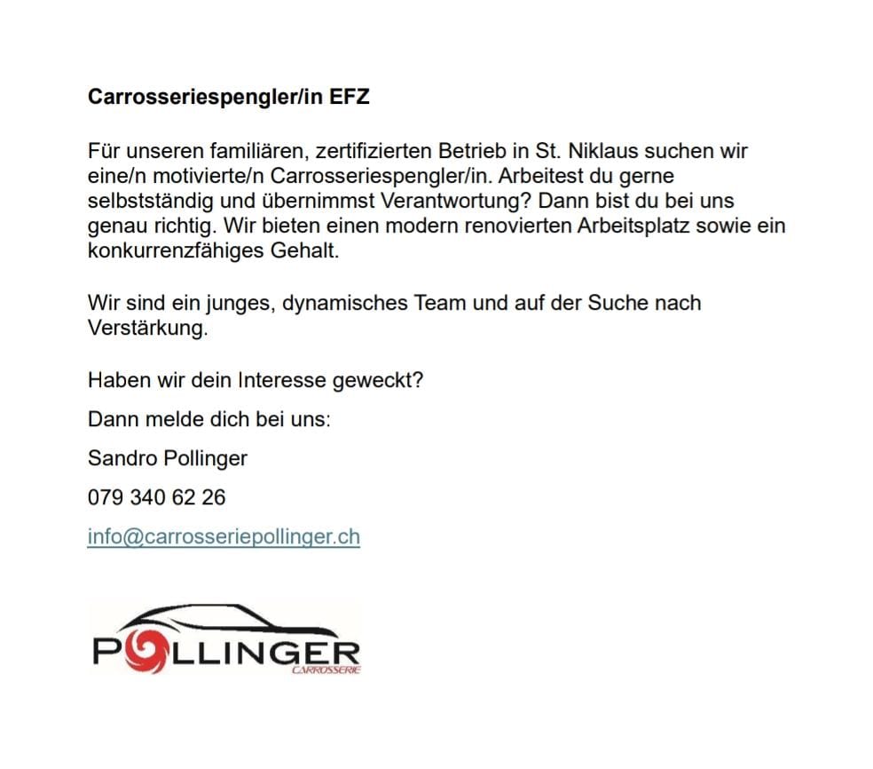 Wir suchen ab sofort oder nach Vereinbarung einen Carrosseriespengler EFZ. Melde ich bei uns!